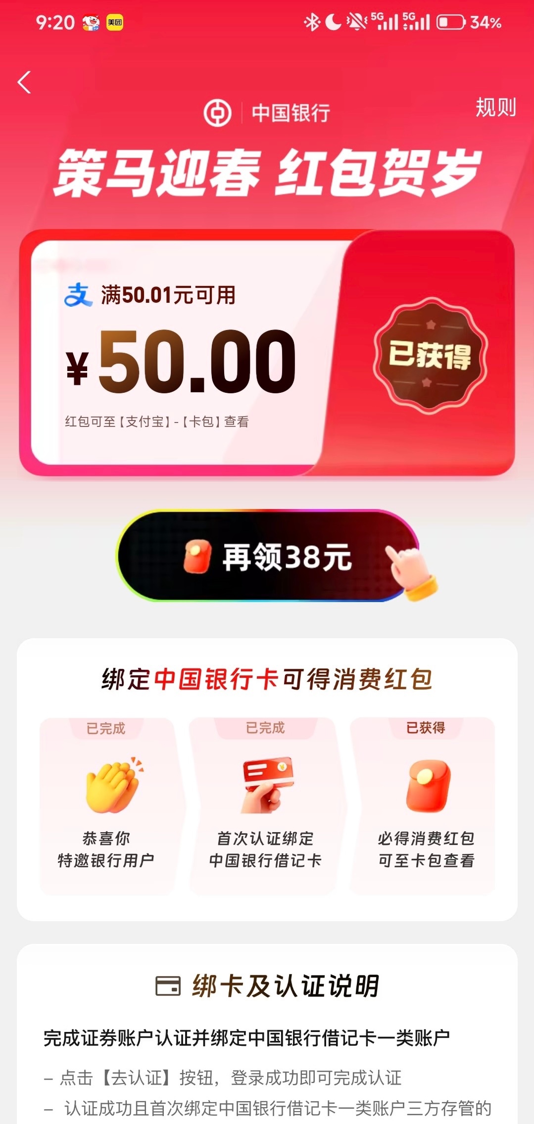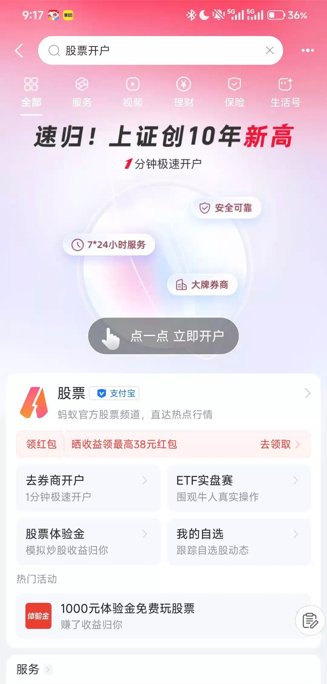 中国银行支付宝中信证券开户50大毛,看图支付宝搜 股票开户 弹图1 入口在下面的红包 进去后就是图二(特邀特邀) 没有图二莫中出我 开户成功后红包直接到卡包了50